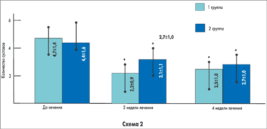 Препарат РОФИКА вызывал достоверное уменьшение количества болезненных и припухших суставов. Сравнительно с диклофенаком имела место тенденция к более выраженному противовоспалительному эффекту (схема 2). На схеме 2 отображена динамика суставного синдрома по количеству вовлеченных суставов для 1 группы (РОФИКА) и 2 группы (диклофенак) через 2 и 4 недели лечения.