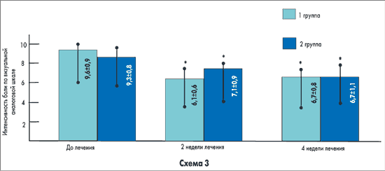 Препарат Рофика вызывал достоверное уменьшение интенсивности боли по визуальной аналоговой шкале в сравнении с диклофенаком (схема 3). На схеме 3 отображена динамика болевых ощущений для группы 1 — при применении РОФИКИ и группы 2 — диклофенака через 2 и 4 недели лечения.
