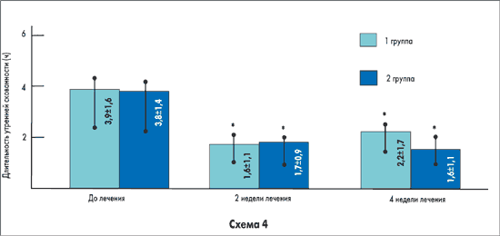 Препарат РОФИКА достоверно уменьшал длительность утренней скованности сравнительно с диклофенаком (схема 4). На схеме 4 отображена динамика утренней скованности для 1 и 2 групп через 2 и 4 недели лечения. Заметно увеличение утренней скованности у пациентов группы РОФИКА при смене препарата на диклофенак.