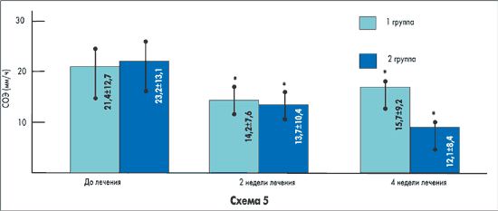 РОФИКА вызывала достоверное замедление СОЭ (схема 5). На схеме 5 отображена динамика СОЭ через 2 и 4 недели лечения. При смене РОФИКИ на диклофенак у 1 группы по истечении 4 недель лечения показатели СОЭ повышались, у пациентов группы диклофенака, наоборот, после приема РОФИКИ снижались.