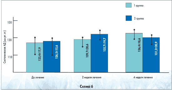 Не было существенных различий между уровнями АД в группах, получающих РОФИКУ и диклофенак (схема 6). На схеме отображены уровни систолического АД до лечения, через 2 и 4 недели лечения.