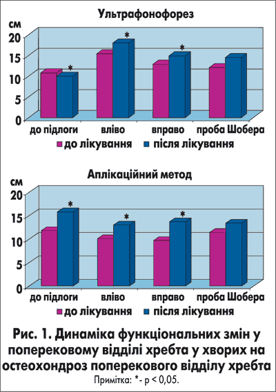 У хворих на остеохондроз значно знизився індекс болю та підвищилась функціональна спроможність поперекового відділу хребта, що проявлялося в збільшенні об’єму рухів та згинання в попереку, підвищенням показників проби Шобера (рис. 1). Причому, не було виявлено суттєвої різниці між результатами лікування в групах з аплікаційним та апаратним способом застосування Дип Реліф-гелю.