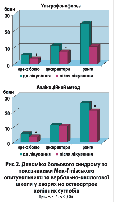 У групі хворих на остеоартроз колінних суглобів по завершенню курсу лікування загальний індекс болю зменшився майже вдвічі, динаміка больового синдрому була більш вираженою при аплікаційному застосуванні препарату (рис. 2).