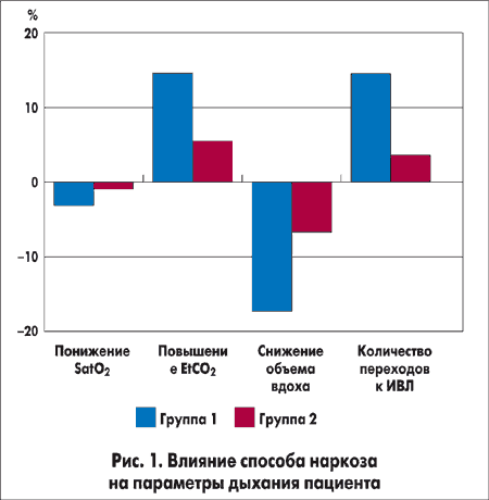 При оценке результатов в обеих группах было выявлено, что интраоперационная аналгезия была достаточно эффективной. Несмотря на отсутствие достоверной разницы показателей SatO2 в обеих группах в условиях ингаляции кислорода, в группе 1 отмечалась гораздо большая депрессия дыхания (рис. 1): объем вдоха (Vt) снизился на 17,3% в группе 1 против 6,7% в группе 2 (р<0,05), показатель EtCO2 повысился на 14,6% в группе 1 в сравнении с 5,5% в группе 2 (р<0,05). Большее депрессивное действие на функцию дыхания наркоза кетамином подтверждает значительно большее число вынужденных переходов на ИВЛ у пациентов группы 1 (8 пациентов или 14,5%), против группы 2 (1 пациент или 1,8%).