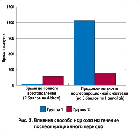 Значительно отличались показатели восстановления (рис. 2). Так, полное восстановление (9 баллов по шкале Aldrett) в группе 1 длилось 174±35 мин, в группе 2 этот показатель составил 28±11 мин.