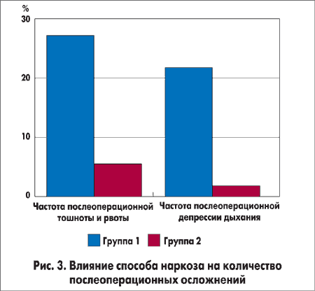 Частота послеоперационной тошноты и рвоты в группе 1 составила 27,1%, в группе 2 — 5,5% (рис. 3). Послеоперационная депрессия дыхания в группе 1 составила 21,8%, в группе 2 — 1,8%, но в обоих случаях она была умеренной и не потребовала продленной ИВЛ.