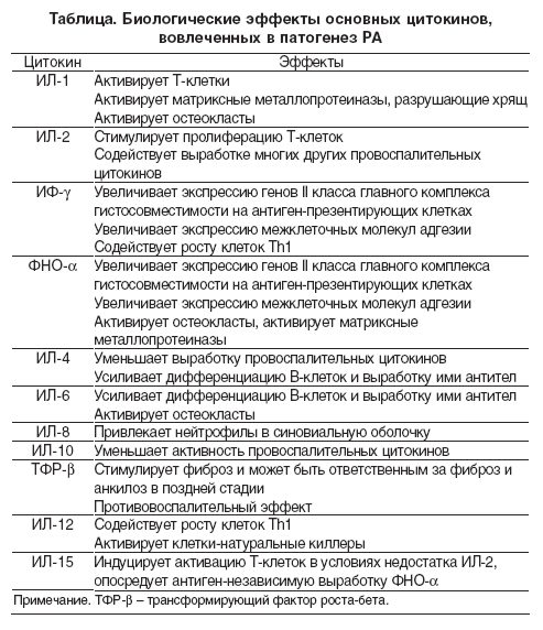 Центральными провоспалительными цитокинами, ответственными за формирование деструктивного клеточно-гуморального потенциала в синовиальной оболочке, являются ФНО-α и ИЛ-1. Они вырабатываются активированными Т-клетками, моноцитами, макрофагами, фибробластами и эндотелиоцитами. ФНО-α способствует высвобождению других провоспалительных цитокинов, включая ИЛ-1, ИЛ-6 и ИЛ-8, высвобождению и активации разрушающих хрящ матриксных металлопротеиназ, экспрессии молекул адгезии, которые обеспечивают миграцию клеток в воспаленную ткань. ИЛ-1 и ИЛ-2, обладая и собственной провоспалительной активностью, стимулируют выработку других провоспалительных (ИЛ-6, ИЛ-8, ИЛ-12, гранулоцито-макрофагальный колониестимулирующий фактор – ГМ-КСФ и др.) и противовоспалительных цитокинов (ИЛ-4, ИЛ-10, растворимый рецептор ФНО, растворимый рецептор и антагонист ИЛ-1 и др.) со смещением баланса в пользу первой группы. Связующим звеном между активацией клеточного и гуморального иммунитета является ИЛ-6, который играет важную роль в дифференциации В-клеток в клетки, секретирующие антитела. Показано, что уровни ИЛ-6 положительно коррелируют с уровнями РФ. Хотя в последние годы спектр приписываемых ФНО-α и ИЛ-1 биологических эффектов несколько сузился за счет рассредоточения их функций среди других интерлейкинов и интерферона-гамма (ИФ-γ) (см. таблицу), однако они по-прежнему считаются ключевыми фигурами цитокинового каскада. Это подтверждается клинической эффективностью лекарственных препаратов, нейтрализующих активность ФНО-α и ИЛ-1 (этанерцепт, инфликсимаб, адалимумаб, анакинра и др.) [5, 15, 19, 26].