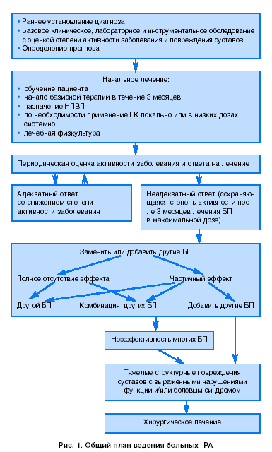 Для достижения поставленных целей требуется комплексный подход, включающий обучение пациента, его активное и регулярное сотрудничество с врачом-ревматологом, применение медикаментозных средств, лечебной физкультуры, ортопедических приспособлений и хирургических вмешательств, физиотерапевтических методов и курортных факторов (рис. 1).