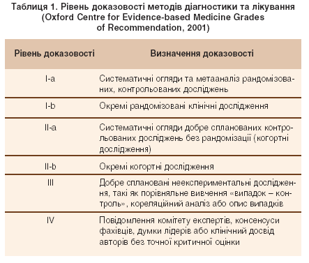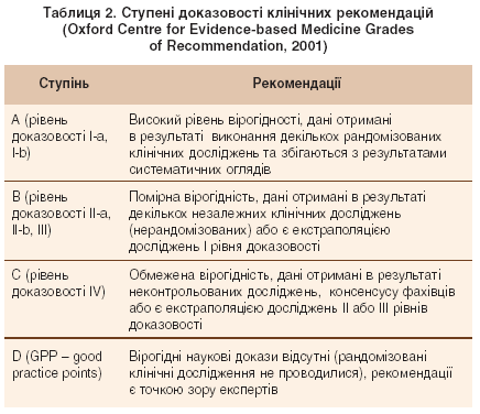 Тому вважаємо за необхідне розглянути питання щодо призначення антибактеріального лікування хворим на пієлонефрит саме з позицій доказової медицини; критерії визначення рівнів доказовості та ступеня вірогідності клінічних рекомендацій подані у таблицях 1, 2 [2, 9, 27].
