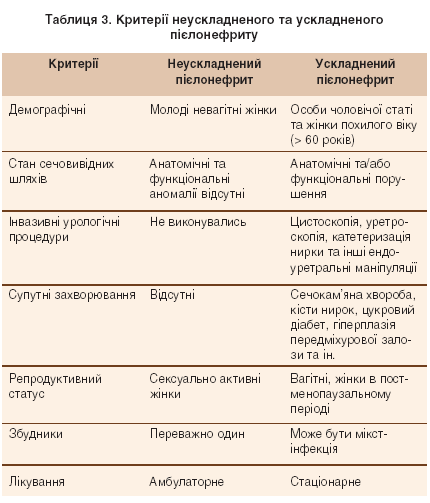 Необхідність встановлення критеріїв ускладненого пієлонефриту обґрунтована обсягом та тривалістю лікування, а також умовами його проведення (амбулаторно або в стаціонарі). Неускладнений пієлонефрит – бактеріально обумовлене ураження інтерстицію нирки у здорової, сексуально активної невагітної жінки віком від 16 до 65 років. Пієлонефрит у осіб чоловічої статі або за наявності анатомічних чи функціональних порушень у жінок є, відповідно, ускладненим (рівень доказовості С) [8, 18, 23]. Критерії неускладненого та ускладненого пієлонефриту подані в таблиці 3.