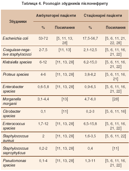 За даними світової літератури, серед збудників пієлонефриту переважає грамнегативна флора, яка виявляється у 80% хворих [11, 13, 28]. Друге місце, за даними різних авторів, посідають Proteus mirabilis – 14-16% [11], Enterococci – 21% [11, 28], Klebsiella pneumoniae – 12-15% [13]. За умов неускладненого пієлонефриту переважають: E. coli, Proteus mirabilis, Klebsiella pneumoniae, S. Saprophyticus, S.epidermidis, при ускладненому – E. coli, Klebsiella spp., Proteus spp., Pseudomonas spp., Serratia spp., Enterococcusspp., Staphylococcus spp., Candida spp. [13, 22]. Розподіл збудників, що викликають пієлонефрит, наведено у таблиці 4.