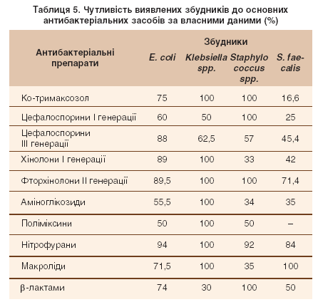 Дані власних досліджень щодо виявлених збудників майже не відрізняються від вище зазначених. Чутливість виявлених бактерій до основних антибактеріальних препаратів в Україні подано у таблиці 5.