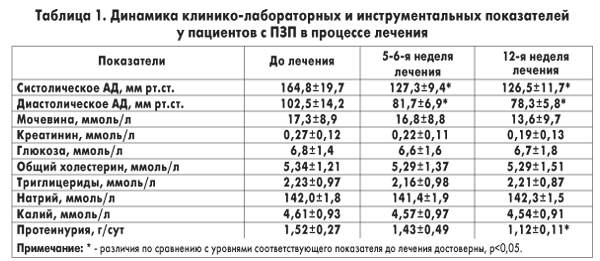 Под нашим проспективным наблюдением находилось 42 пациента с ПЗП (14 — с хроническим гломерулонефритом, 8 — с гломерулонефритами при системной красной волчанке и 20 — с диабетической нефропатией на фоне сахарного диабета 2 типа), среди которых было 26 женщин и 16 мужчин в возрасте от 19 до 58 лет (в среднем, 34,4±9,4 года). В 13 из 22 случаев диагноз гломерулонефрита (ГН) устанавливался морфологически на основании прижизненного гистологического исследования почечной ткани, в остальных случаях ГН и во всех случаях диабетической нефропатии диагностика осуществлялась клинически на основании общепринятых рекомендаций. У всех обследованных по стандартным методикам определяли суточные потери белка с мочой, концентрационную способность почек в пробе С. С. Зимницкого, уровни мочевины, креатинина, глюкозы, холестерина, триглицеридов, натрия и калия сыворотки крови. АГ имела место у всех обследованных пациентов и была представлена как «мягкая» (при значениях АД от 140/90 до 159/99 мм рт. ст.) в 16, «умеренная» (АД в пределах 160/100 — 179/109 мм рт. ст.) — в 18 и «тяжелая» (АД 180/110 мм рт. ст. и более) — в 8 наблюдениях. Длительность АГ составляла у 11 больных менее 1 года, у 17 — от 1 года до 3 лет и у 14 — превышала 3 года. Уровни протеинурии широко варьировали и были представлены как минимальные (до 1 г/сут) в 15 случаях, умеренные (1-3 г/сут) — в 19 и выраженные (более 3 г/сут) с развитием нефротического синдрома — в 8 случаях. Функция почек была сохранена у 17 больных; ХПН начальной степени была у 26, выраженной — у 9 пациентов.
