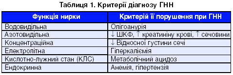 Критерії діагнозу ГНН: олігоанурія, зниження швидкості клубочкової фільтрації (ШКФ), відносної густини сечі (осмоляльності), підвищення концентрації креатиніну, сечовини, калію сироватки крові, порушення кислотно-лужної рівноваги, анемія, гіпертензія (табл. 1).