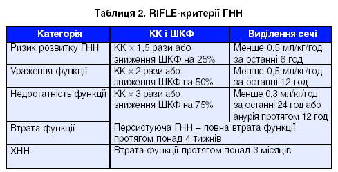 Принциповим при ГНН є ступінь порушення функцій нирок та тривалість цього стану. Тому в практиці розрізняють функціональну і органічну ГНН. Функціональна ГНН – це тимчасове порушення деяких функцій нирок, яке має зворотний розвиток при проведенні консервативної терапії. Органічна ГНН не має зворотного розвитку без застосування екстракорпоральних методів лікування та характеризується більш широким спектром порушення різних функцій нирок. Для об'єктивізації розуміння функціональної та органічної ГНН використовують критерії RIFLE – Renal Failure (табл. 2) [4].