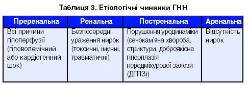 За причинами виникнення виділяють преренальну (60-70%), ренальну (25-40%), постренальну (5-10%) і аренальну (< 1%) ГНН (табл. 3) [2]. Преренальна ГНН характеризується співвідношенням сечовини до креатиніну більше ніж 20:1, осмоляльністю сечі більше ніж 500 мОсмоль/л, фракційним виділенням натрію менше 1% та відсутністю або незначним сечовим синдромом. І навпаки, за наявності ренальної ГНН співвідношення сечовини до креатиніну не перебільшує 20:1, осмоляльність сечі знаходиться в межах 250-300 мОсмоль/л, фракційна екскреція натрію становить більше 3% за наявності сечового синдрому.