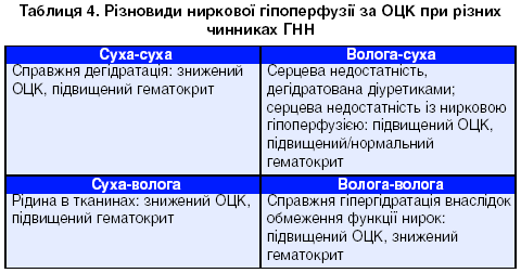 Гіпоперфузія на фоні ГНН має різновиди за об'ємом циркулюючої крові (ОЦК) (табл. 4).