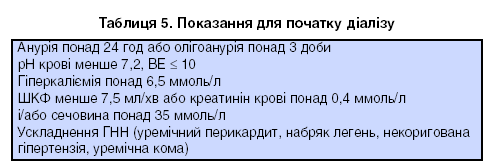 У разі неможливості фармакологічного відновлення діурезу визначають показання для проведення діалізу (табл. 5).