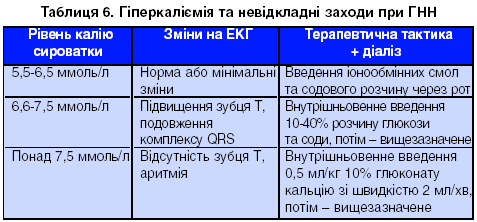 Дуже небезпечним станом, який розвивається при ГНН, є гіперкаліємія. Невідкладні заходи визначаються за рівнем калію сироватки крові (табл. 6).