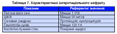 Інтерстиціальний нефрит як наслідок ГНН характеризується (табл. 7) зниженням відносної густини (питомої ваги) в ранковому аналізі сечі (менше 1 018) або в аналізі за Зимницьким, зниженням ШКФ менше 90 мл/хв або підвищенням креатиніну крові приблизно понад 0,125 ммоль/л у дорослих та понад 0,104 ммоль/л у дітей, наявністю сечового синдрому, який найчастіше представлений мікроальбумінурією/протеїнурією та анемією.