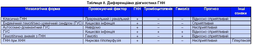Диференційну діагностику ГНН проводять із гострою декомпенсацією на фоні ХНН (ГНН при ХНН), гемолітикоуремічним синдромом (наявність тромбоцитопенії та гемолізу), хворобою Мошковіца (табл. 8).