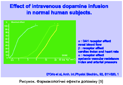 Проба на відновлення діурезу. Пробу проводять при АТ > 60 мм рт. ст., за відсутності гіпергідратації за показниками ОЦК та гематокриту (різновид гіпоперфузії нирок «волога- волога» (табл. 4)) та відсутності сечі в сечовому міхурі за даними УЗД. Спочатку, за наявності підвищеного гематокриту, проводять внутрішньовенну інфузію 20 мл/кг фізіологічного розчину або 5% альбуміну протягом 30-60 хв. Потім внутрішньовенно вводять 2,4% розчин еуфіліну із розрахунку 1 мл/10 кг маси тіла і послідовно 2-7 мг/кг фуросеміду (торасеміду). За відсутності відновлення сечовиділення впродовж 1,5-2 годин повторно вводять фуросемід (бажано введення торасеміду з урахуванням меншого токсичного ефекту на нирки) до досягнення сумарної дози за два введення не більше 15 мг/кг. У разі відсутності сечогінного ефекту проводять титроване введення допаміну (добутаміну) в нирковій дозі 1,5-3,5 мкг/кг/хв цілодобово (рисунок). Критерієм адекватності підібраної дози є відсутність гіпертензії. За умови підвищення рівня АТ від початкового на фоні введення допаміну дозу останнього слід титровано знижувати. Тривалість уведення даного препарату визначається строками початку діалізу. За відсутності такої можливості із соціальних або медичних причин застосування допаміну може успішно тривати безперервно [1].