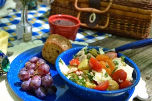 - Кроме мяса, обязательно возьмите на пикник и другие продукты. Очень полезными являются свежие овощи (салат, петрушка, укроп, зеленый лук), а также овощи, приготовленные на гриле – морковь, кабачки, картофель, перец. Приготовленные салаты из свежих овощей лучше употребить перед основным блюдом, поскольку они улучшают работу кишечника. Копчености, сало, острые специи и соусы лучше оставьте дома.