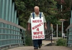 Американец-пенсионер вполне может претендовать на титул самого любящего мужа планеты: когда его жене понадобилась пересадка почки, он вышел на дороги своего штата с плакатом, взывающим к милосердию – и добрая душа нашлась: жизнь женщины была спасена.