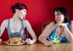 Психологическое состояние играет огромную роль как в выборе вида еды, так и ее количества. Большое значение с этой точки зрения имеет и подсознательное копирование поведения других людей – поэтому во время приема пищи присутствие толстяков опасно.
